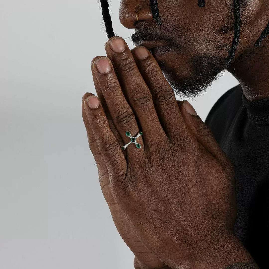 Each teardrop gem is carefully set to form a powerful symbol. The moissanite delivers diamond-like clarity and fire, while the green zirconia adds depth and edge. Together, they create a design that feels both modern and ritualistic—sharp, symbolic, and unapologetically bold.