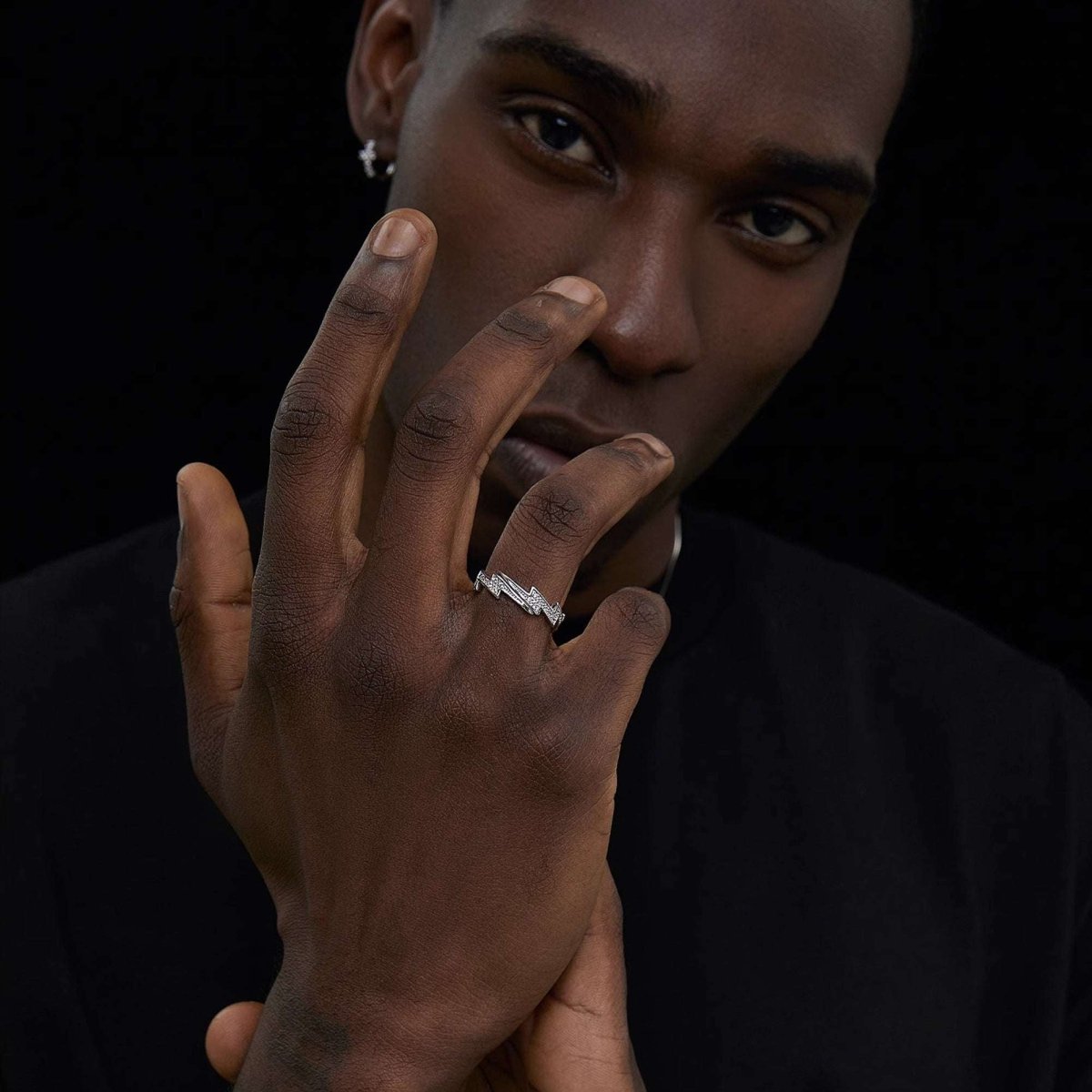The lightning bolt is fully accented with pavé-set zircon stones, chosen for their clarity and brilliance. Each stone reflects light at every angle, creating an electrifying shimmer that adds depth and drama. The contrast between the polished silver and the radiant stones gives the ring an edge that works in any setting.
